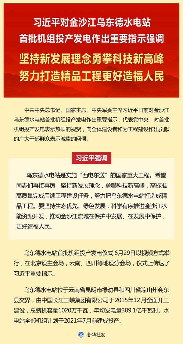 新華社:習(xí)近平對(duì)金沙江烏東德水電站首批機(jī)組投產(chǎn)發(fā)電作出重要指示強(qiáng)調(diào)