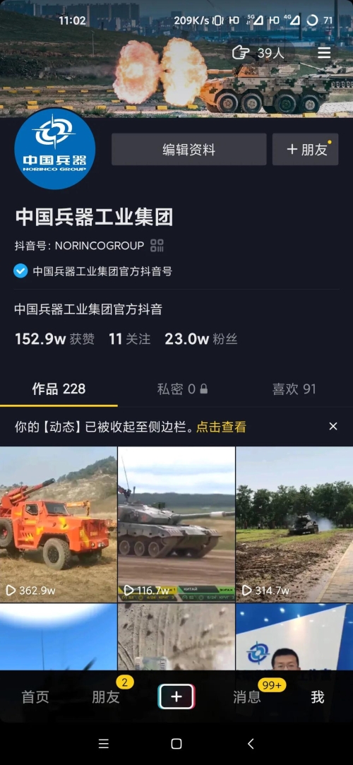 近日 中國(guó)兵器工業(yè)集團(tuán)抖音號(hào) 喜獲殊榮 成為2020年政務(wù)抖音號(hào) 優(yōu)秀創(chuàng)作者 2020年1月 集團(tuán)公司抖音號(hào)正式開通 近1年來,短視頻宣傳取得良好效果 截至目前,共發(fā)布視頻228個(gè) 總粉絲數(shù)23萬(wàn),獲贊152萬(wàn) 播放總量已超8000萬(wàn) |