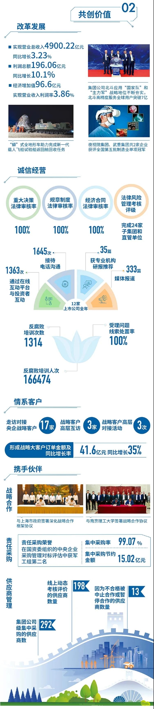 近日,國(guó)務(wù)院國(guó)資委在京舉辦“責(zé)任創(chuàng)造價(jià)值,責(zé)任引領(lǐng)未來——中央企業(yè)社會(huì)責(zé)任報(bào)告集中發(fā)布活動(dòng)(2021)”,來自中央企業(yè)的92份《報(bào)告》向公眾全面展示央企認(rèn)真履行社會(huì)責(zé)任的成果。兵器工業(yè)集團(tuán)參加集中發(fā)布活動(dòng),并向社會(huì)公眾正式發(fā)布第十二份年度社會(huì)責(zé)任報(bào)告——《中國(guó)兵器工業(yè)集團(tuán)有限公司2020年社會(huì)責(zé)任報(bào)告》,全面披露2020年度集團(tuán)公司履責(zé)實(shí)踐和履責(zé)成效。會(huì)上發(fā)布了《中央企業(yè)社會(huì)責(zé)任藍(lán)皮書(2021)》,《中國(guó)兵器工業(yè)集團(tuán)有限公司:內(nèi)化于心外化于行,打造央企責(zé)任管理表率》成功入選典型案例。 2020年,是“十三五”規(guī)劃收官之年,也是全面建成小康社會(huì)、實(shí)現(xiàn)第一個(gè)百年目標(biāo)的決勝之年。集團(tuán)公司黨組書記、董事長(zhǎng)焦開河在報(bào)告開篇指出,集團(tuán)公司實(shí)現(xiàn)了“十三五”圓滿收官,整體步入了高質(zhì)量發(fā)展軌道,呈現(xiàn)出基礎(chǔ)更牢、動(dòng)力更強(qiáng)、空間更大、效能更高的積極向上良好態(tài)勢(shì)。在“十三五”特別是近三年來的工作實(shí)踐中,我們明確了“集團(tuán)公司是國(guó)家安全和國(guó)防建設(shè)的脊梁、是國(guó)家戰(zhàn)略科技力量最為重要的組成部分、是黨和國(guó)家最可信賴的‘六個(gè)力量’,肩負(fù)著支撐國(guó)防軍隊(duì)建設(shè)、推動(dòng)科技自立自強(qiáng)、服務(wù)構(gòu)建新發(fā)展格局的重大政治責(zé)任和光榮使命,具有極強(qiáng)的政治屬性,性質(zhì)特殊、使命特殊、責(zé)任特殊”的新時(shí)代新階段職責(zé)使命,深化了對(duì)“堅(jiān)持以習(xí)近平新時(shí)代中國(guó)特色社會(huì)主義思想定向領(lǐng)航,是集團(tuán)公司高質(zhì)量發(fā)展的根本遵循;保持貫徹落實(shí)習(xí)近平總書記重要指示批示和黨中央決策部署的戰(zhàn)略定力,是集團(tuán)公司高質(zhì)量發(fā)展的根本前提;履行好強(qiáng)軍這個(gè)首要職責(zé),是集團(tuán)公司高質(zhì)量發(fā)展的根本要求;加快兵器科技創(chuàng)新突破,是集團(tuán)公司高質(zhì)量發(fā)展的根本支撐;加強(qiáng)黨的領(lǐng)導(dǎo)黨的建設(shè),是集團(tuán)公司高質(zhì)量發(fā)展的根本保證”的兵器工業(yè)改革發(fā)展規(guī)律認(rèn)識(shí)。 《報(bào)告》聚焦“抗疫斗爭(zhēng)中的‘兵器力量’”,生動(dòng)展示了集團(tuán)公司抗擊疫情的有力行動(dòng),展現(xiàn)了集中力量辦大事、急國(guó)家之所急的“兵器速度”,彰顯了“把一切獻(xiàn)給黨”的人民兵工精神和貫徹落實(shí)國(guó)家決策部署的責(zé)任擔(dān)當(dāng)。《報(bào)告》以“用心守候和平、用情溫暖社會(huì)”為主題,從恪守本責(zé)、共創(chuàng)價(jià)值、致力和諧、踐行綠色、責(zé)任管理五個(gè)維度,全面展現(xiàn)集團(tuán)公司在堅(jiān)持履行政治責(zé)任、經(jīng)濟(jì)責(zé)任、社會(huì)責(zé)任,履行強(qiáng)軍首責(zé)、加強(qiáng)黨的建設(shè)、打造國(guó)家戰(zhàn)略科技力量、推進(jìn)“一帶一路”倡議、打好打贏三大攻堅(jiān)戰(zhàn)、深化改革、助力員工成長(zhǎng)、支持社會(huì)公益事業(yè)、提升社會(huì)責(zé)任管理等方面的生動(dòng)實(shí)踐和履責(zé)亮點(diǎn),凸顯集團(tuán)公司保持貫徹落實(shí)黨中央決策部署的戰(zhàn)略定力、在聚焦主責(zé)主業(yè)、科技引領(lǐng)、國(guó)際化經(jīng)營(yíng)上持續(xù)用力,為實(shí)現(xiàn)第一個(gè)百年奮斗目標(biāo)貢獻(xiàn)力量的初心與行動(dòng)?!秷?bào)告》再次獲得中國(guó)企業(yè)社會(huì)責(zé)任報(bào)告評(píng)級(jí)專家委員會(huì)“五星佳”最高評(píng)級(jí),兵器工業(yè)集團(tuán)成為軍工行業(yè)唯一連續(xù)10年獲得最高評(píng)級(jí)的企業(yè)。 2021年是開啟新征程的開局之年,也是建黨100周年、人民兵工創(chuàng)建90周年,兵器工業(yè)集團(tuán)將全面貫徹落實(shí)黨中央戰(zhàn)略部署,緊扣推動(dòng)高質(zhì)量發(fā)展主題,圍繞“十四五”開好局、起好步,堅(jiān)決完成黨中央賦予的職責(zé)使命,履行好中央企業(yè)和軍工集團(tuán)的政治責(zé)任、經(jīng)濟(jì)責(zé)任、社會(huì)責(zé)任,為實(shí)現(xiàn)中國(guó)夢(mèng)強(qiáng)軍夢(mèng)作出新的更大貢獻(xiàn)! 一圖看懂《中國(guó)兵器工業(yè)集團(tuán)有限公司2020年社會(huì)責(zé)任報(bào)告》 |