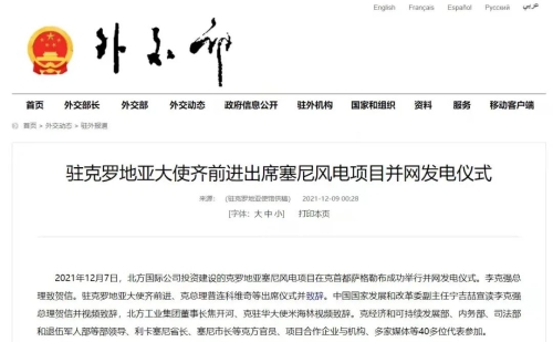 2021年12月7日,中國兵器工業(yè)集團(tuán)有限公司北方公司所屬北方國際投資、建設(shè)和運(yùn)營的塞尼156MW風(fēng)電項(xiàng)目在克羅地亞首都薩格勒布隆重舉行并網(wǎng)發(fā)電儀式。李克強(qiáng)總理致賀信。克羅地亞總理安德烈·普連科維奇,中國駐克羅地亞大使齊前進(jìn)出席儀式并致辭。中國國家發(fā)展和改革委員會副主任寧吉喆宣讀李克強(qiáng)總理賀信并視頻致辭,中國兵器工業(yè)集團(tuán)有限公司董事長焦開河、克駐華大使米海林視頻致辭。