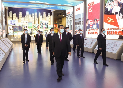新近落成的中國共產(chǎn)黨歷史展覽館巍然矗立,氣勢(shì)恢宏。下午3時(shí)20分許,習(xí)近平等黨和國家領(lǐng)導(dǎo)同志來到這里,步入展廳參觀展覽。展覽以“不忘初心、牢記使命”為主題,精心設(shè)計(jì)了“建立中國共產(chǎn)黨 奪取新民主主義革命偉大勝利”、“成立中華人民共和國 進(jìn)行社會(huì)主義革命和建設(shè)”、“實(shí)行改革開放 開創(chuàng)和發(fā)展中國特色社會(huì)主義”、“推進(jìn)中國特色社會(huì)主義進(jìn)入新時(shí)代 全面建成小康社會(huì) 開啟全面建設(shè)社會(huì)主義現(xiàn)代化國家新(人民日?qǐng)?bào))征程”4個(gè)部分,通過2600余幅圖片、3500多件套文物實(shí)物,第一次全方位、全過程、全景式、史詩般展現(xiàn)中國共產(chǎn)黨波瀾壯闊的百年歷程,濃墨重彩地反映黨的不懈奮斗史、不怕犧牲史、理論探索史、為民造福史、自身建設(shè)史,使人們深刻認(rèn)識(shí)到紅色政權(quán)來之不易、新中國來之不易、中國特色社會(huì)主義來之不易,深刻認(rèn)識(shí)到中國共產(chǎn)黨為什么能、馬克思主義為什么行、中國特色社會(huì)主義為什么好。