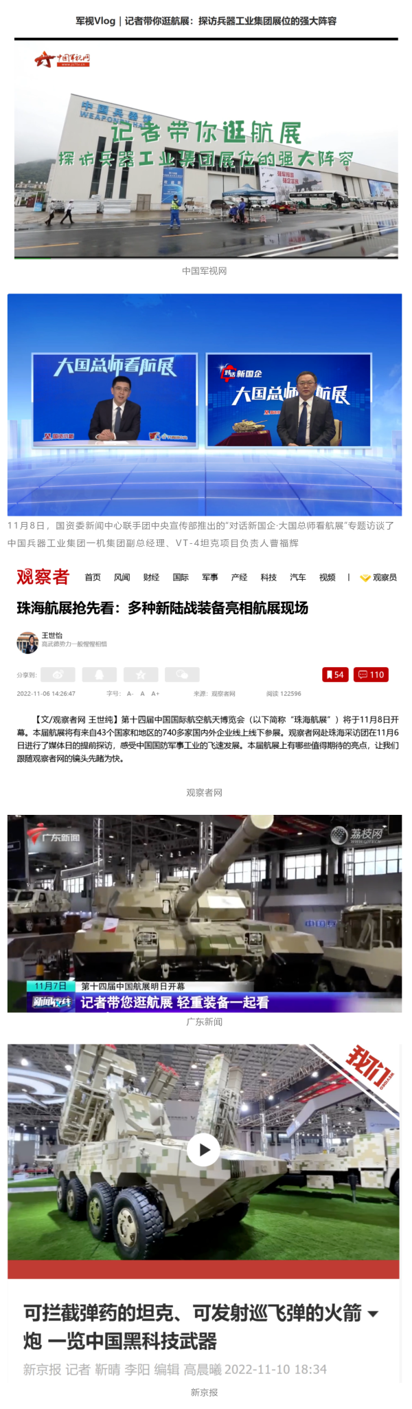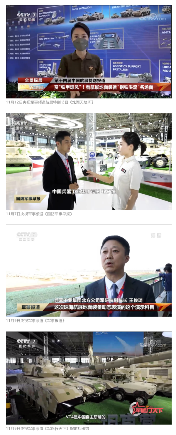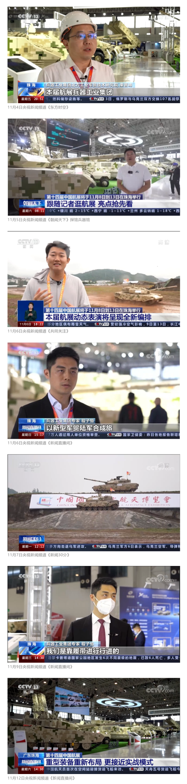 央視國防軍事頻道航展特別報道《炫舞天地間》11月12日《賞“鐵甲雄風”!看航展地面裝備“鋼鐵洪流”名場面》對兵器工業(yè)集團武器裝備特色亮點進行報道。《國防軍事早報》11月7日推出報道《第十四屆中國國際航空航天博覽會明天開幕 中國兵器館首次以陸軍合成旅實戰(zhàn)體系形式展出》,對兵器館陸軍合成旅實戰(zhàn)體系進行報道?!盾娛聢蟮馈?1月9日推出《第十四屆中國國際航空航天博覽會 地面兵器裝備首次聯(lián)合陸航直升機進行動態(tài)展示》報道。《軍迷行天下》11月9日推出報道《軍迷打卡航展2022》以專業(yè)軍迷視角探館兵器館,全面展示兵器工業(yè)集團參展裝備特色亮點。