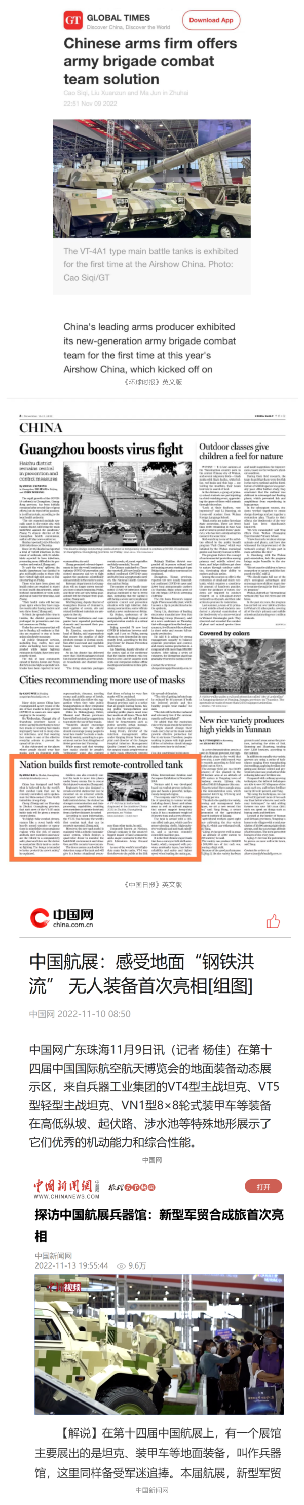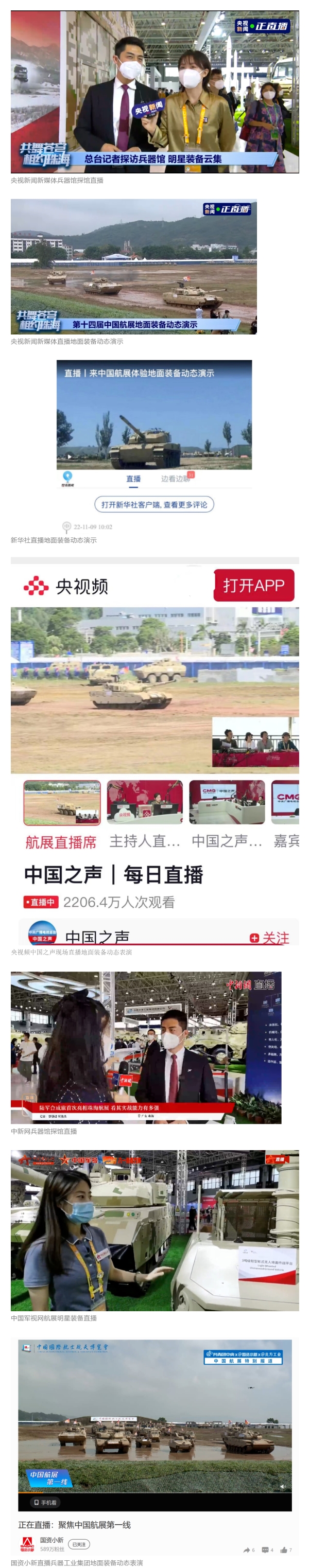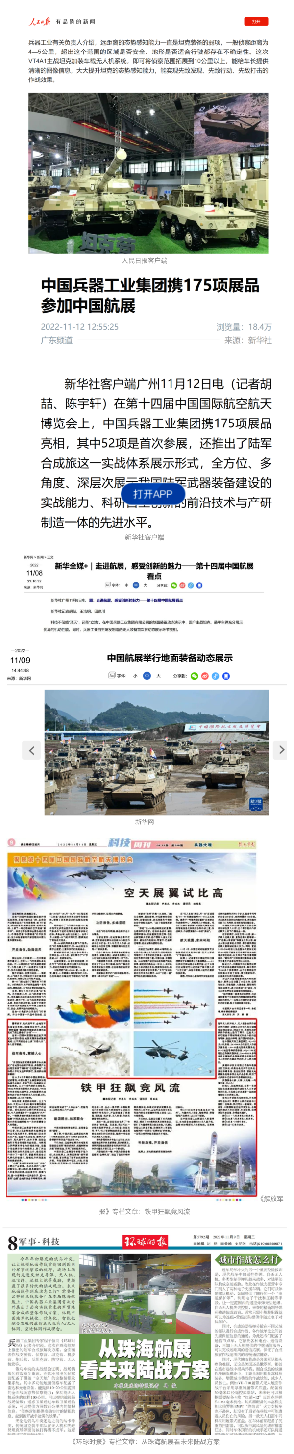 央視國防軍事頻道航展特別報道《炫舞天地間》11月12日《賞“鐵甲雄風”!看航展地面裝備“鋼鐵洪流”名場面》對兵器工業(yè)集團武器裝備特色亮點進行報道。《國防軍事早報》11月7日推出報道《第十四屆中國國際航空航天博覽會明天開幕 中國兵器館首次以陸軍合成旅實戰(zhàn)體系形式展出》,對兵器館陸軍合成旅實戰(zhàn)體系進行報道?!盾娛聢蟮馈?1月9日推出《第十四屆中國國際航空航天博覽會 地面兵器裝備首次聯(lián)合陸航直升機進行動態(tài)展示》報道。《軍迷行天下》11月9日推出報道《軍迷打卡航展2022》以專業(yè)軍迷視角探館兵器館,全面展示兵器工業(yè)集團參展裝備特色亮點。