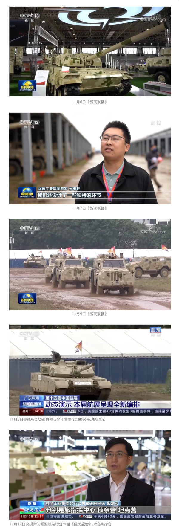 11月4日至12日,央視新聞頻道播出《第十四屆中國航展將于11月8日到13日在珠海舉行 展品已就位 中國航展進入倒計時》《第十四屆中國航展將于11月8日到13日在珠海舉行 全新布局 兵器館首次搭建實景指揮中心》《第十四屆中國航展將于11月8日到13日在珠海舉行 本屆航展動態(tài)表演將呈現(xiàn)全新編排》《第十四屆中國航展 有人無人協(xié)同配合 打造新型火炮智能組合》《廣東珠海 第十四屆中國航展 功能新 亮點多 地面武器裝備集中亮相》《廣東珠海 第十四屆中國航展 一批高端裝備集中亮相》《廣東珠海 第十四屆中國航展 重型裝備重新布局 更接近實戰(zhàn)模式》等多篇新聞短片,對兵器工業(yè)集團參展情況作了全方位專題報道。