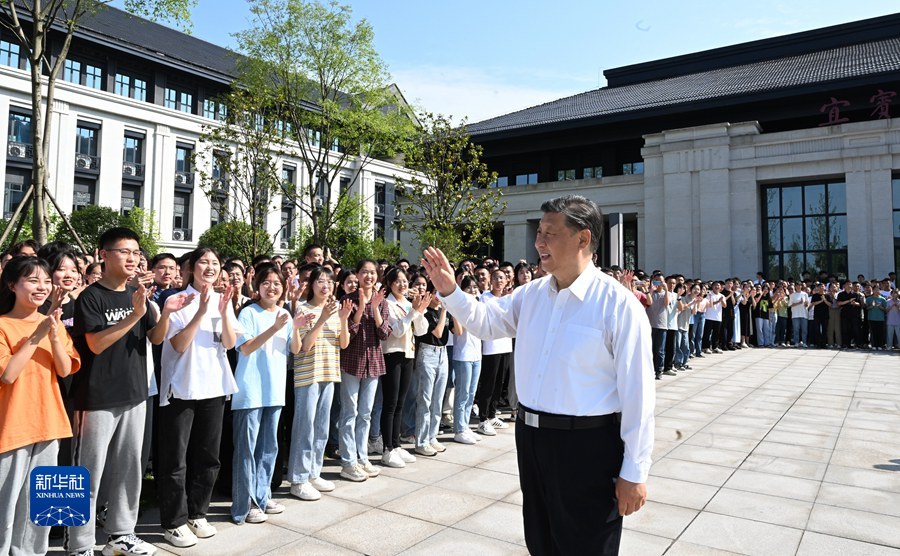 6月8日,中共中央總書記、國(guó)家主席、中央軍委主席習(xí)近平在四川考察。這是8日下午,習(xí)近平在宜賓學(xué)院考察時(shí),向師生們揮手致意。新華社記者 謝環(huán)馳 攝