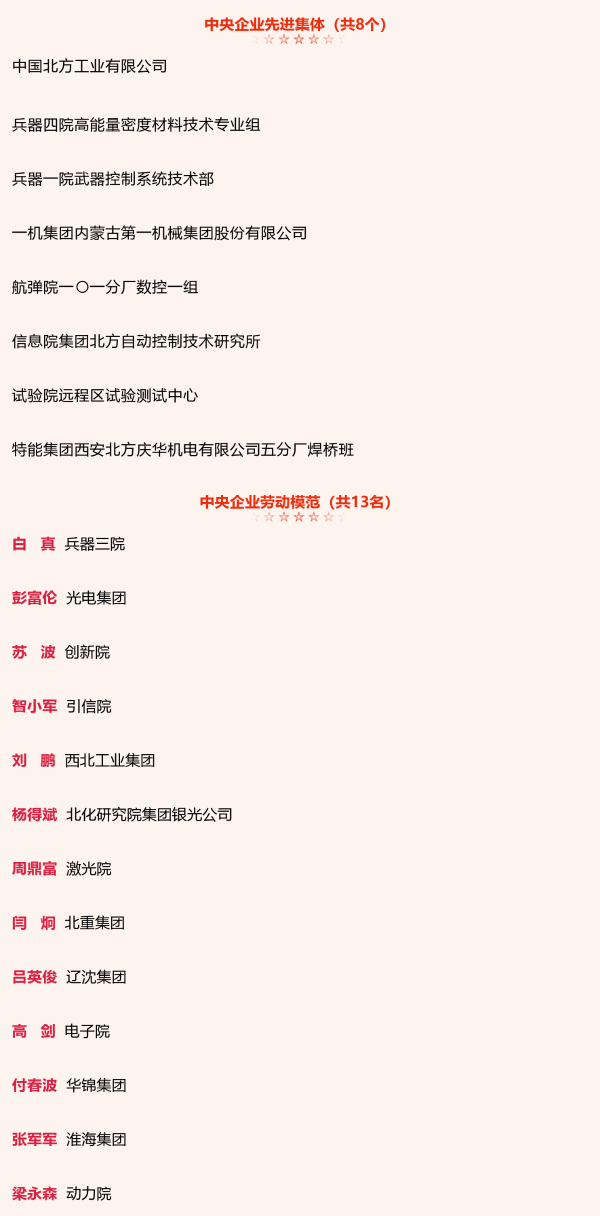兵器工業(yè)集團8個集體和13名個人獲中央企業(yè)先進集體和勞動模范表彰