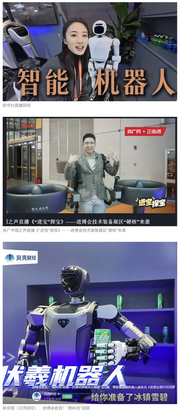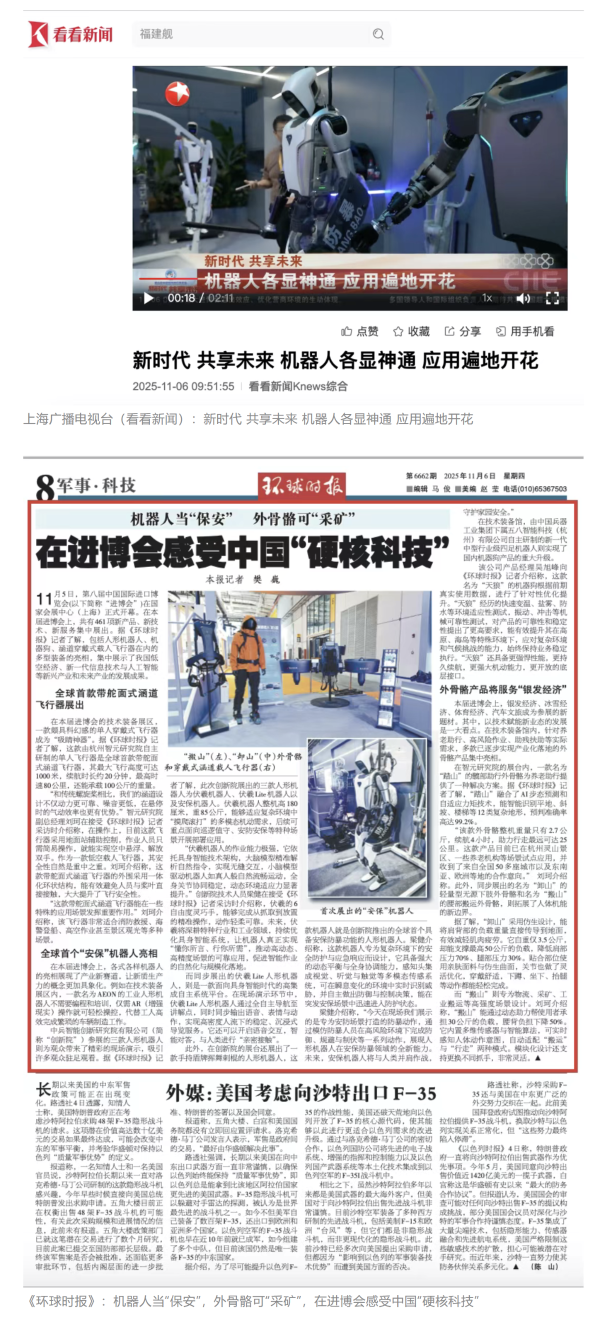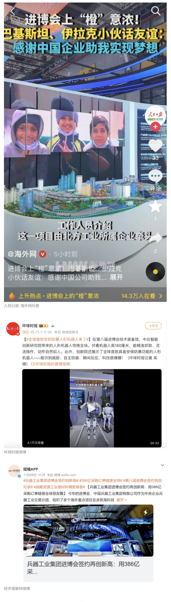 11月5日至10日,中國(guó)兵器工業(yè)集團(tuán)有限公司組團(tuán)參加第八屆中國(guó)國(guó)際進(jìn)口博覽會(huì)。集團(tuán)公司以“堅(jiān)持合作共贏,推進(jìn)高水平對(duì)外開放,助力構(gòu)建新發(fā)展格局”為目標(biāo),圍繞“新征程,共創(chuàng)未來(lái)”主題組團(tuán)參展,集中展示了一系列新技術(shù)、新理念、新成果,取得豐碩成果,受到廣泛關(guān)注。 嘉賓云集 本屆進(jìn)博會(huì)上,蒙古國(guó)駐華大使、贊比亞礦業(yè)和礦產(chǎn)開發(fā)部常任秘書、津巴布韋首席司長(zhǎng)等多國(guó)政要蒞臨集團(tuán)公司組展展區(qū),了解有關(guān)項(xiàng)目情況。 國(guó)家能源集團(tuán)、東風(fēng)汽車、哈電集團(tuán)、鞍鋼集團(tuán)、中鋁集團(tuán)、通用技術(shù)集團(tuán)、中國(guó)中車、中國(guó)長(zhǎng)安汽車、中國(guó)電建等央企領(lǐng)導(dǎo),工信部、國(guó)務(wù)院國(guó)資委、中國(guó)貿(mào)促會(huì)、陜西省、上海市、浙江省等國(guó)內(nèi)政府部門領(lǐng)導(dǎo)以及國(guó)內(nèi)外合作伙伴蒞臨集團(tuán)公司組展展區(qū)參觀指導(dǎo)。對(duì)集團(tuán)公司高質(zhì)量共建“一帶一路”,與各國(guó)合作伙伴共享發(fā)展機(jī)遇、實(shí)現(xiàn)互利共贏給予高度評(píng)價(jià)。 媒體關(guān)注 集團(tuán)公司集中簽約亮相央視綜合頻道《新聞聯(lián)播》、央視新聞?lì)l道《朝聞天下》《新聞30分》《共同關(guān)注》、央視財(cái)經(jīng)頻道《正點(diǎn)財(cái)經(jīng)》《經(jīng)濟(jì)信息聯(lián)播》。 《環(huán)球時(shí)報(bào)》、環(huán)球網(wǎng)、《新京報(bào)》、《中國(guó)旅游報(bào)》等對(duì)集團(tuán)公司人形機(jī)器人、四足機(jī)器人、涵道穿戴式載人飛行器、外骨骼等多型新域新質(zhì)產(chǎn)品,集中亮相進(jìn)行報(bào)道。新華社、央廣中國(guó)之聲、新京報(bào)(貝殼財(cái)經(jīng))、上海廣播電視臺(tái)等媒體直播探館,打卡兵器“硬核科技”。 人民日?qǐng)?bào)客戶端、新華社客戶端、人民網(wǎng)、中國(guó)網(wǎng)、中國(guó)日?qǐng)?bào)網(wǎng)、國(guó)務(wù)院國(guó)資委網(wǎng)站、國(guó)資小新微信公眾號(hào)、國(guó)資小新Facebook、學(xué)習(xí)強(qiáng)國(guó)中央企業(yè)學(xué)習(xí)平臺(tái)、經(jīng)濟(jì)觀察網(wǎng)、新京報(bào)客戶端等第一時(shí)間刊發(fā)集團(tuán)公司組展簽約、ESG建設(shè)等情況。新浪財(cái)經(jīng)、界面新聞等商業(yè)平臺(tái)閱讀量累計(jì)超500萬(wàn)次。 在微博、抖音等新媒體平臺(tái)上,集團(tuán)公司高科技產(chǎn)品演示、5D穹幕電影體驗(yàn)等短視頻持續(xù)引爆流量,累計(jì)播放量超800萬(wàn)次,點(diǎn)贊量破50萬(wàn)?!氨鞴I(yè)集團(tuán)進(jìn)博會(huì)簽約386億”相關(guān)話題登上微博熱搜榜,閱讀量破5000萬(wàn)次。 文字丨劉暢 |
